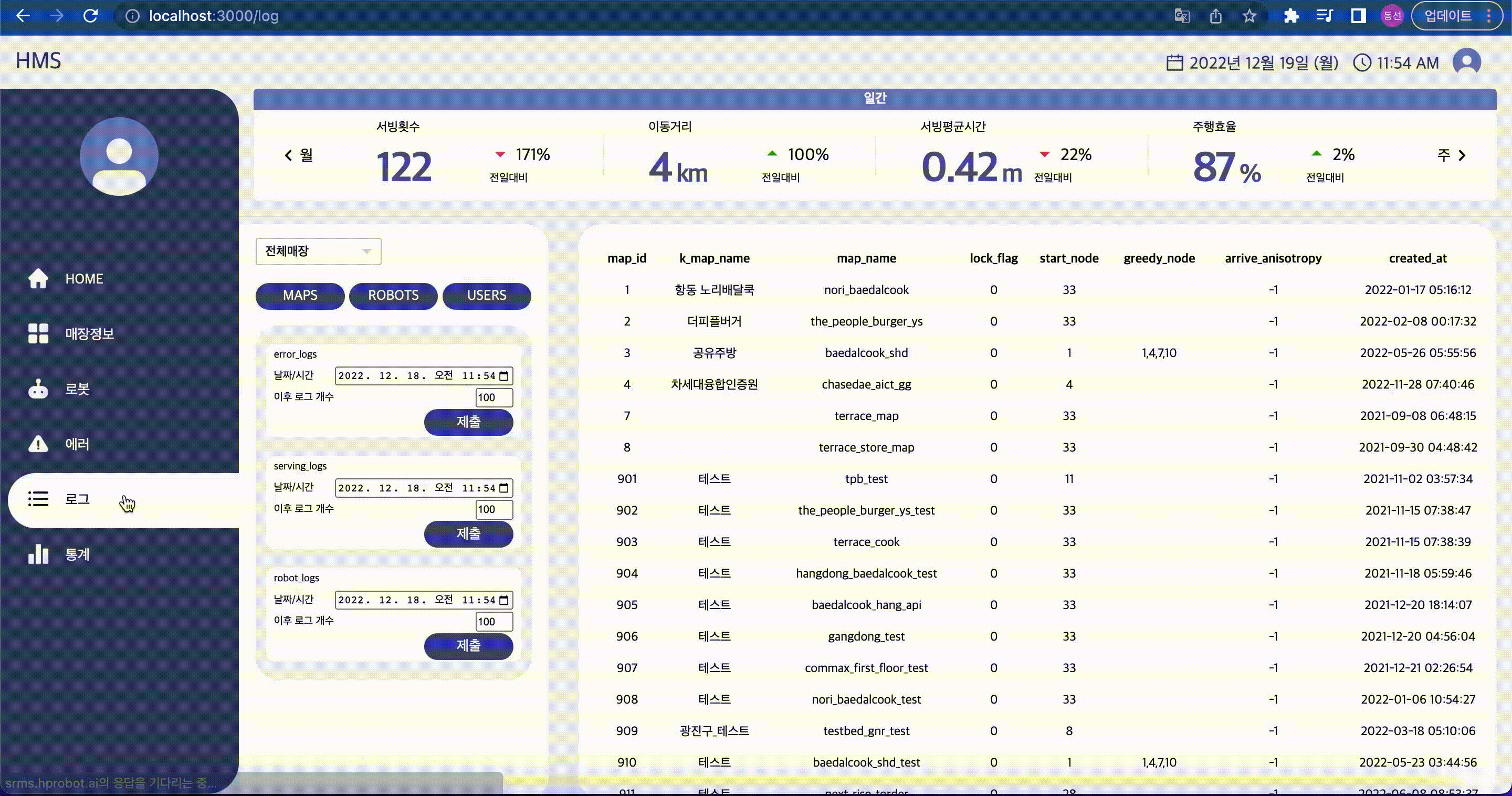 ( maps, robots, users, error_logs, serving_logs, robot_logs ) 각각의 전체 데이터를 받아옴 - 날짜를 지정하여 데이터를 받아오는 필터 기능구현